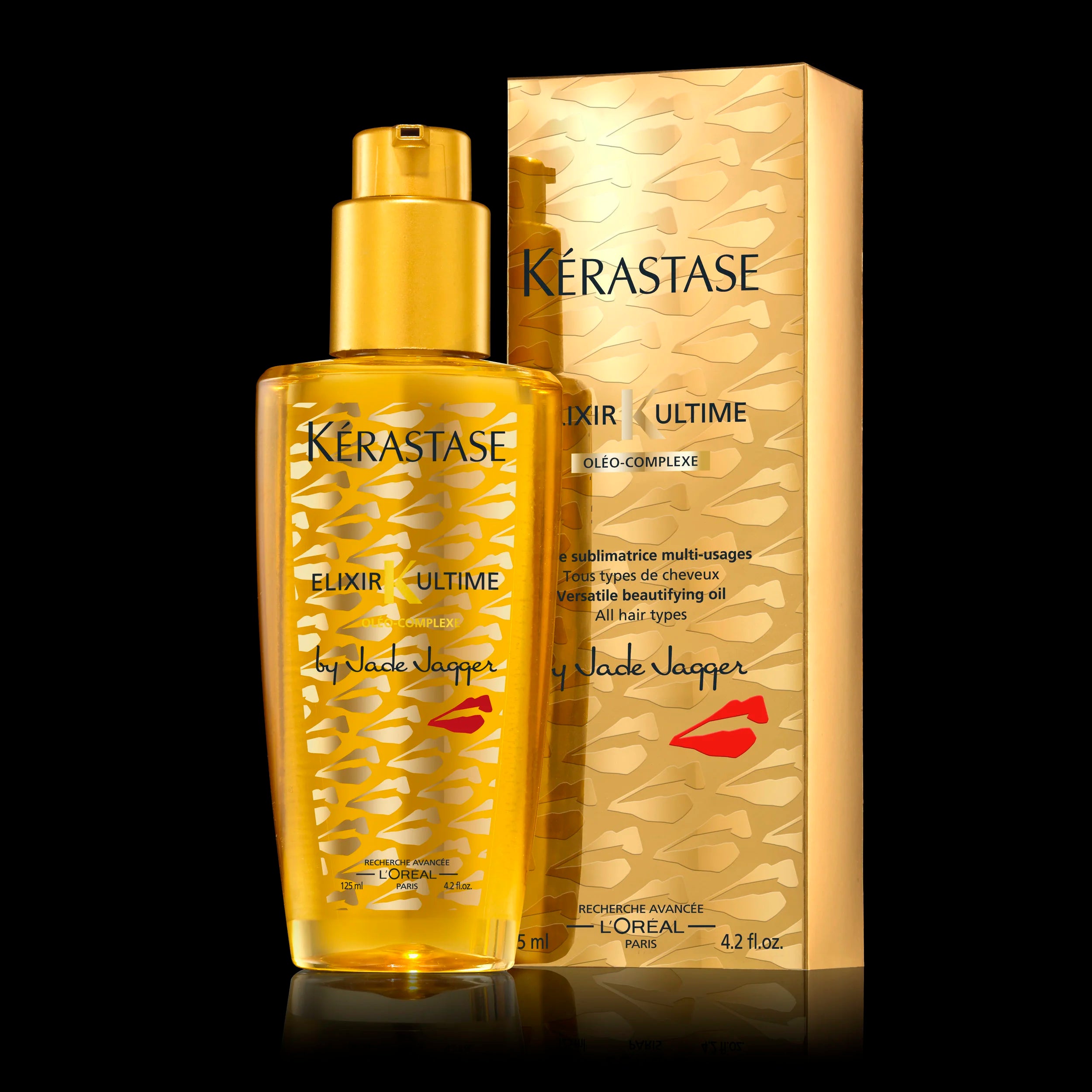 In 2012 Jade Jagger collaborated with leading luxury haircare brand Kérastase, a division of the L'Oreal Group to design, launch and promote a limited edition version of their best selling Elixir Ultime Hair Oil.